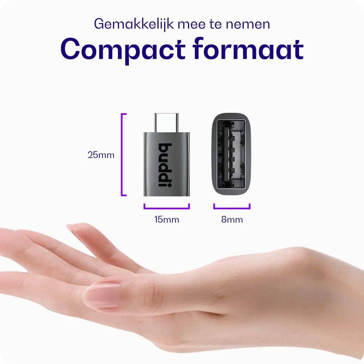 De Buddi Ease USB-A naar USB-C Adapter biedt brede compatibiliteit met een breed scala aan apparaten. Aan de USB-C kant ondersteunt het laptops, telefoons, tablets en andere USB-C toestellen. De USB-A verbinding is perfect voor het aansluiten van kabels, hubs, USB-sticks, toetsenborden en andere apparaten met USB-A aansluiting. Of je nu jouw apparaten wilt verbinden met dataoverdracht of je toestel wilt opladen, het kan allemaal met de Buddi Ease