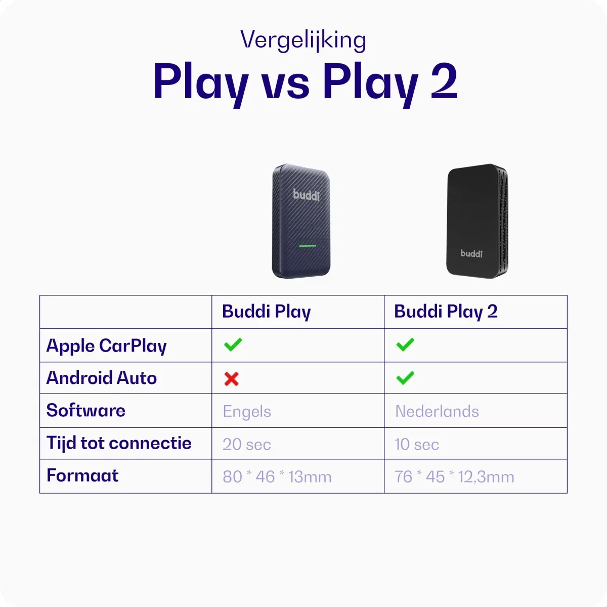 De Buddi Play dongle is geschikt voor auto's die een ingebouwd Apple Carplay systeem hebben met ondersteuning voor bedrade Carplay. Je ontvangt een USB-C naar USB-A en een USB-C naar USB-C kabel zodat je de adapter aansluit op zowel een USB-A als USB-C poort. Door de draadloze verbinding hoef jij je telefoon niet te pakken en houd je beide handen aan het stuur.